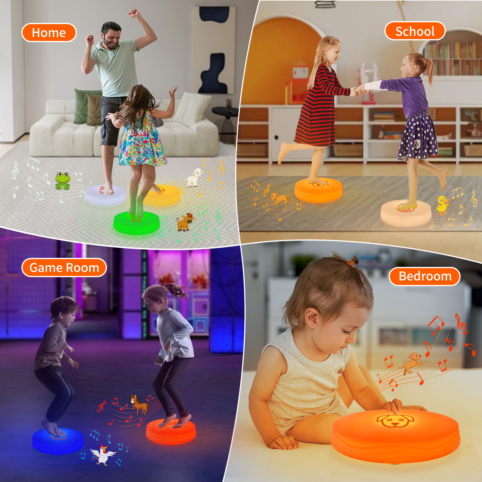 Combining touch-sensitive lighting and animal sound interaction in one device. Step activation triggers 7 animal calls with synchronized color effects (e.g., frog-green). Single-unit integration of all sound/color modes creates immersive family engagement scenarios for playrooms, school activity zones, and educational facilities.