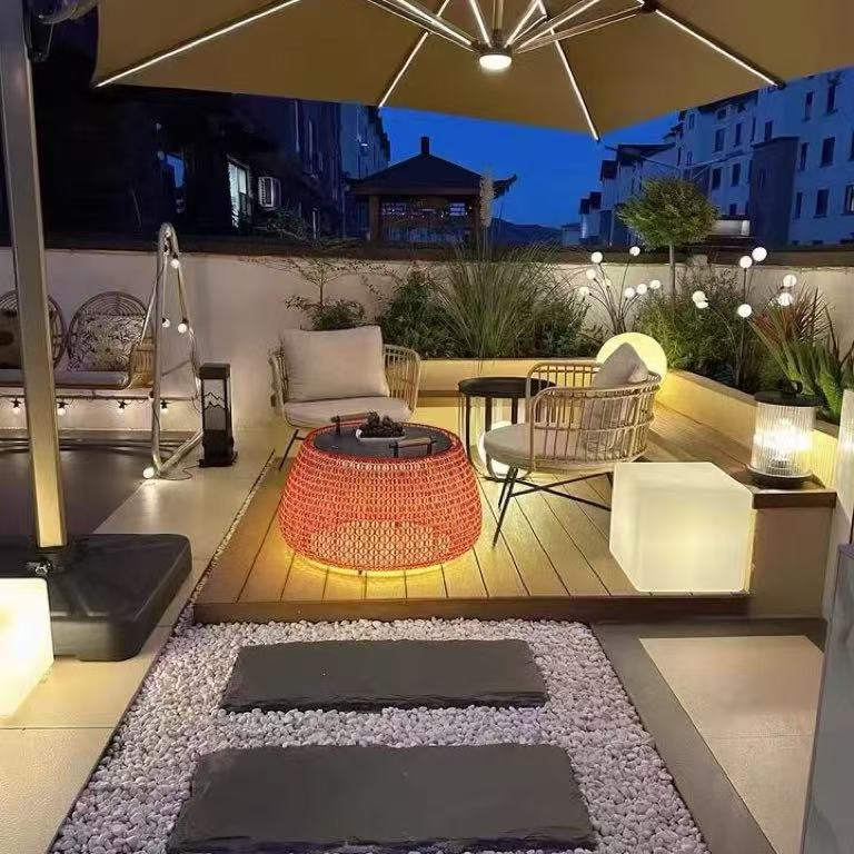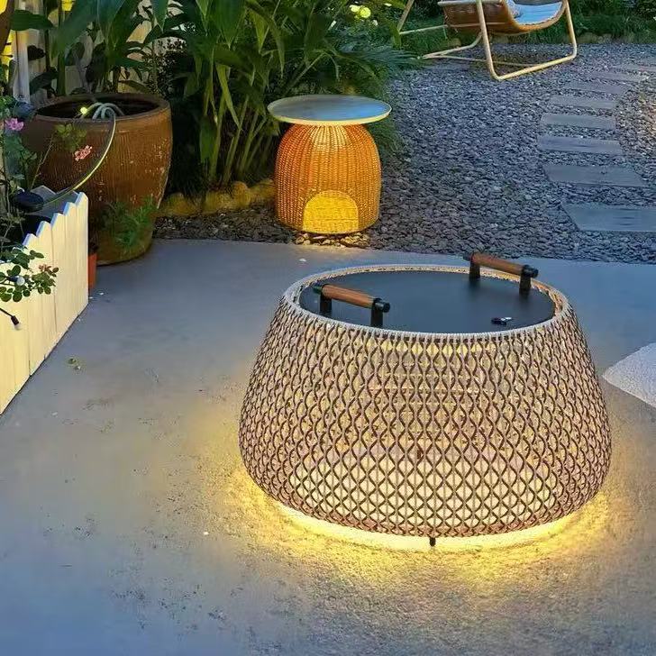 A:This premium solar-powered woven coffee table features a durable wrought iron frame combined with exquisite weaving craftsmanship. Each table lamp functions as a unique art piece. Its distinctive design effortlessly enhances diverse commercial outdoor spaces—whether it's an upscale restaurant patio, a boutique hotel courtyard, or a trendy café terrace. It elevates the ambiance with artistic sophistication, attracts customer attention, and boosts brand value.